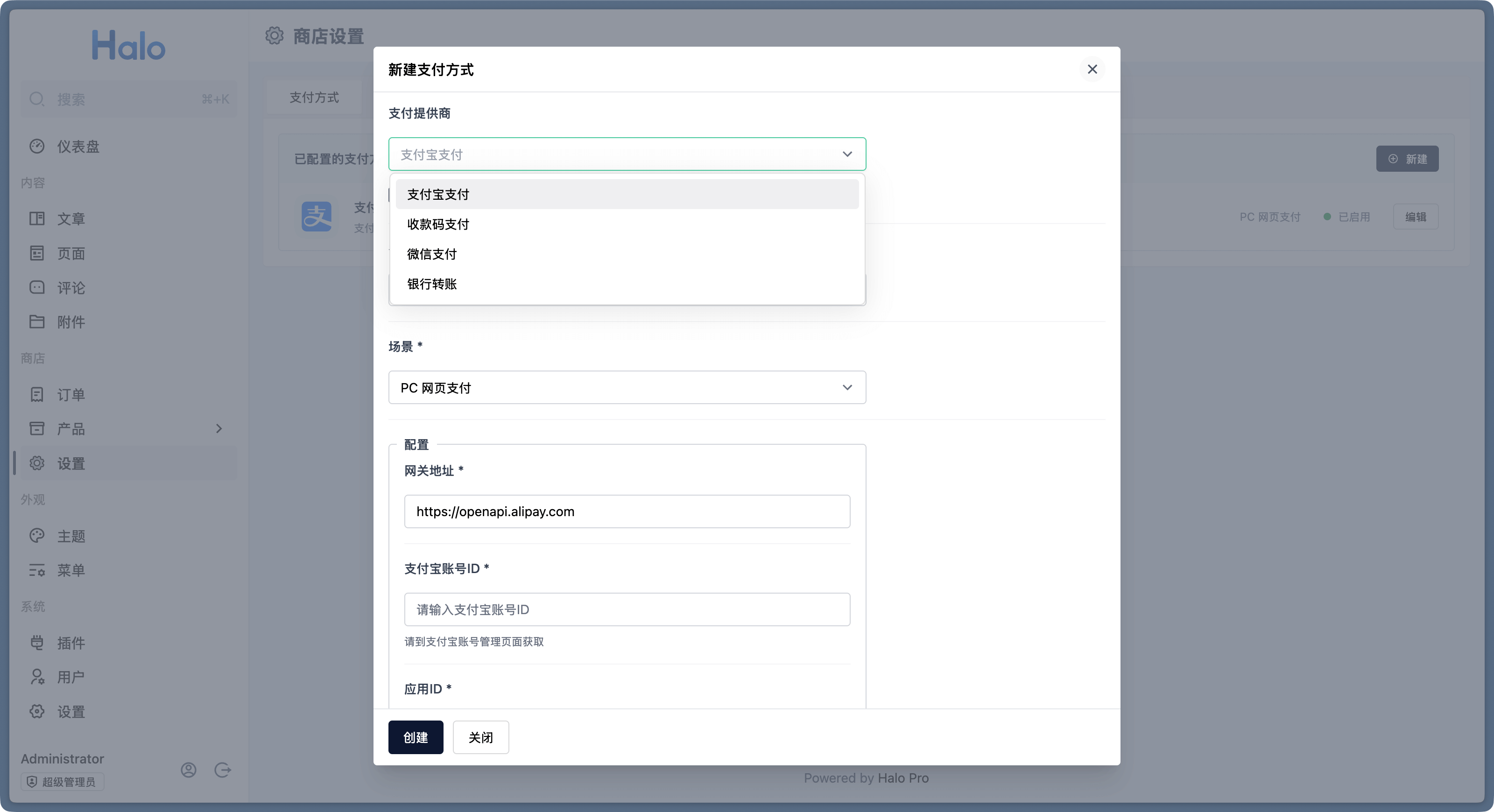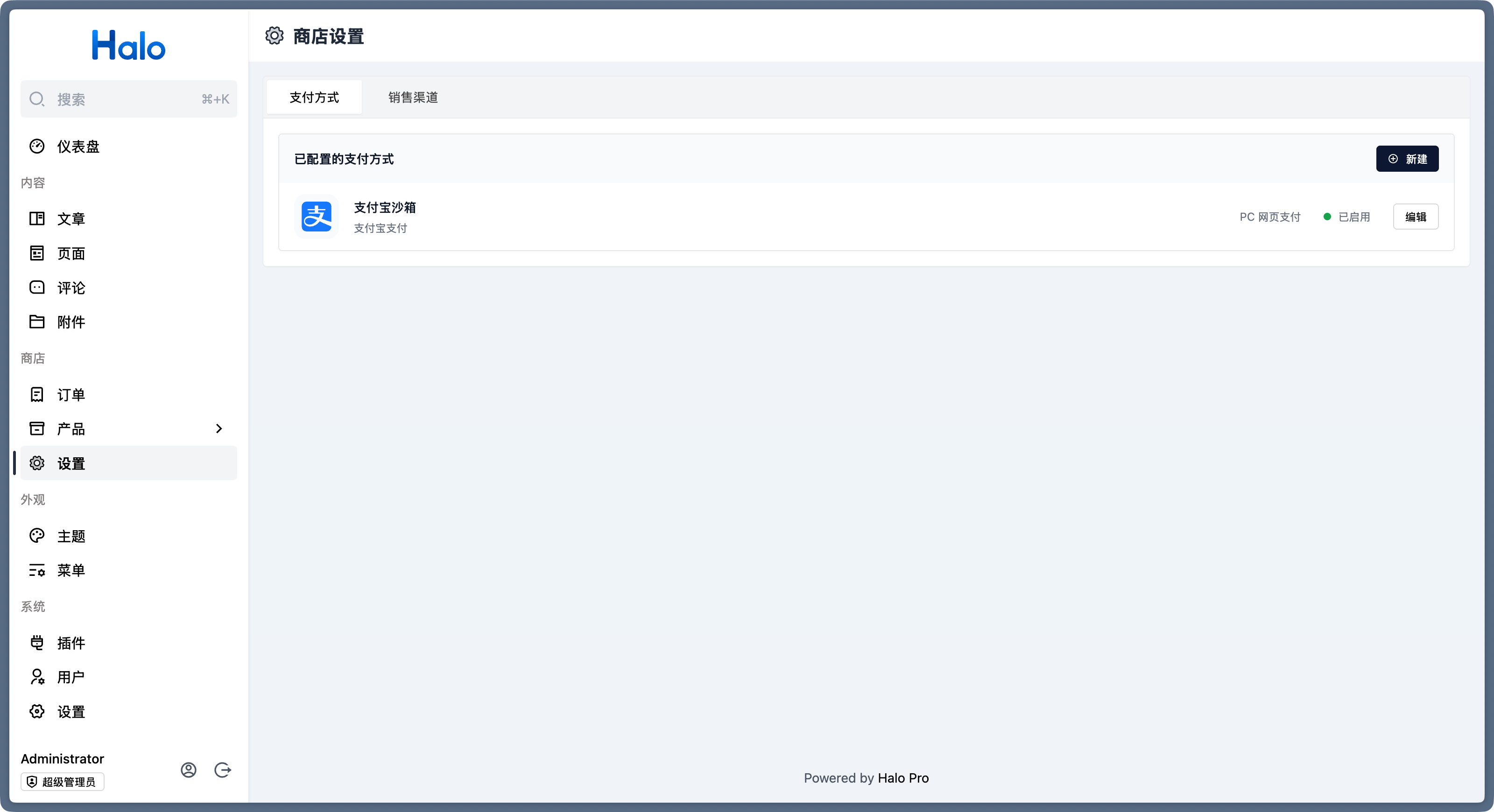 首先登录到 Halo 控制台,进入 商店 -> 设置 -> 支付方式 页面,点击右上角的新建按钮。