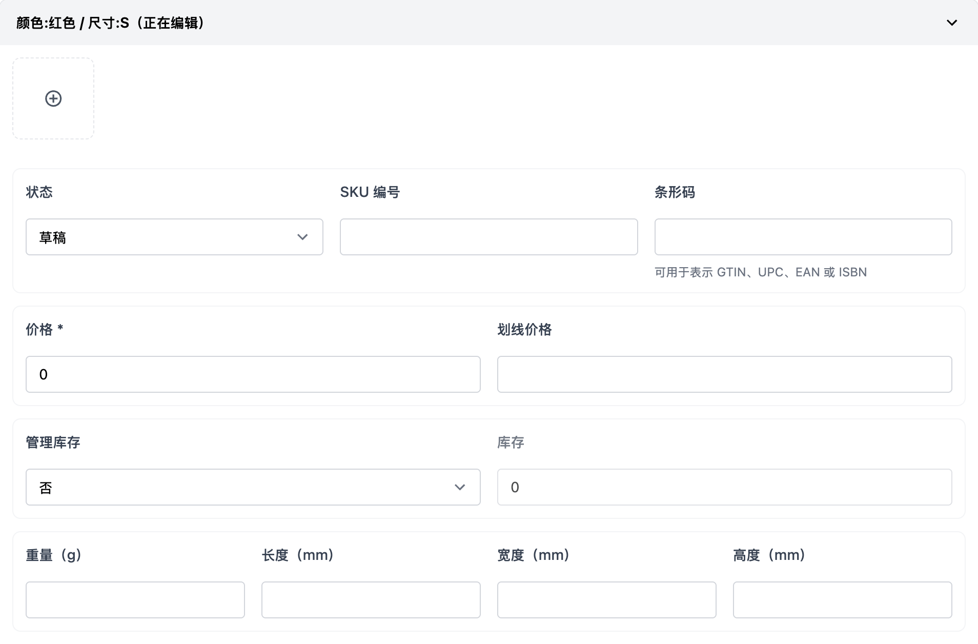 • 库存:规格的库存数量,当库存为0时,用户无法购买